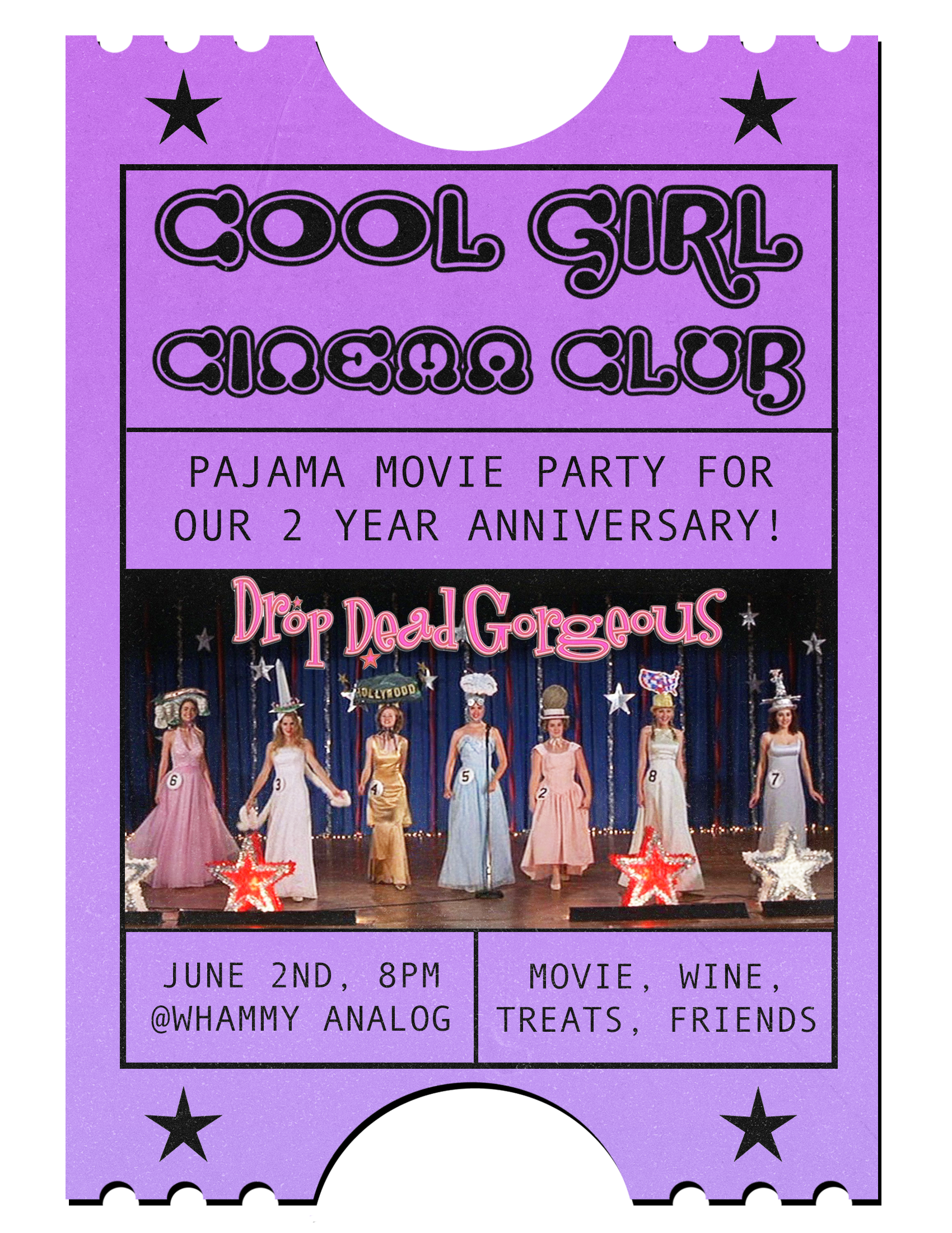Cool Girl Cinema Club is back this month with a special movie screening party of Drop Dead Gorgeous(1999) to celebrate our two year anniversary!! The theme for this event is PAJAMAS so show up wearing your comfiest night-time PJs for this cult classic 90s comedy flick. Join us at 7:30 for the pre-show hang out where we will have come sweet treats and a selection of natural wine for sale curated by Perpetual Wine Party. Come hang out, meet fellow movie lovers, and help us celebrate two years of Cool Girl Cinema Club movie events! Open to anyone and everyone!