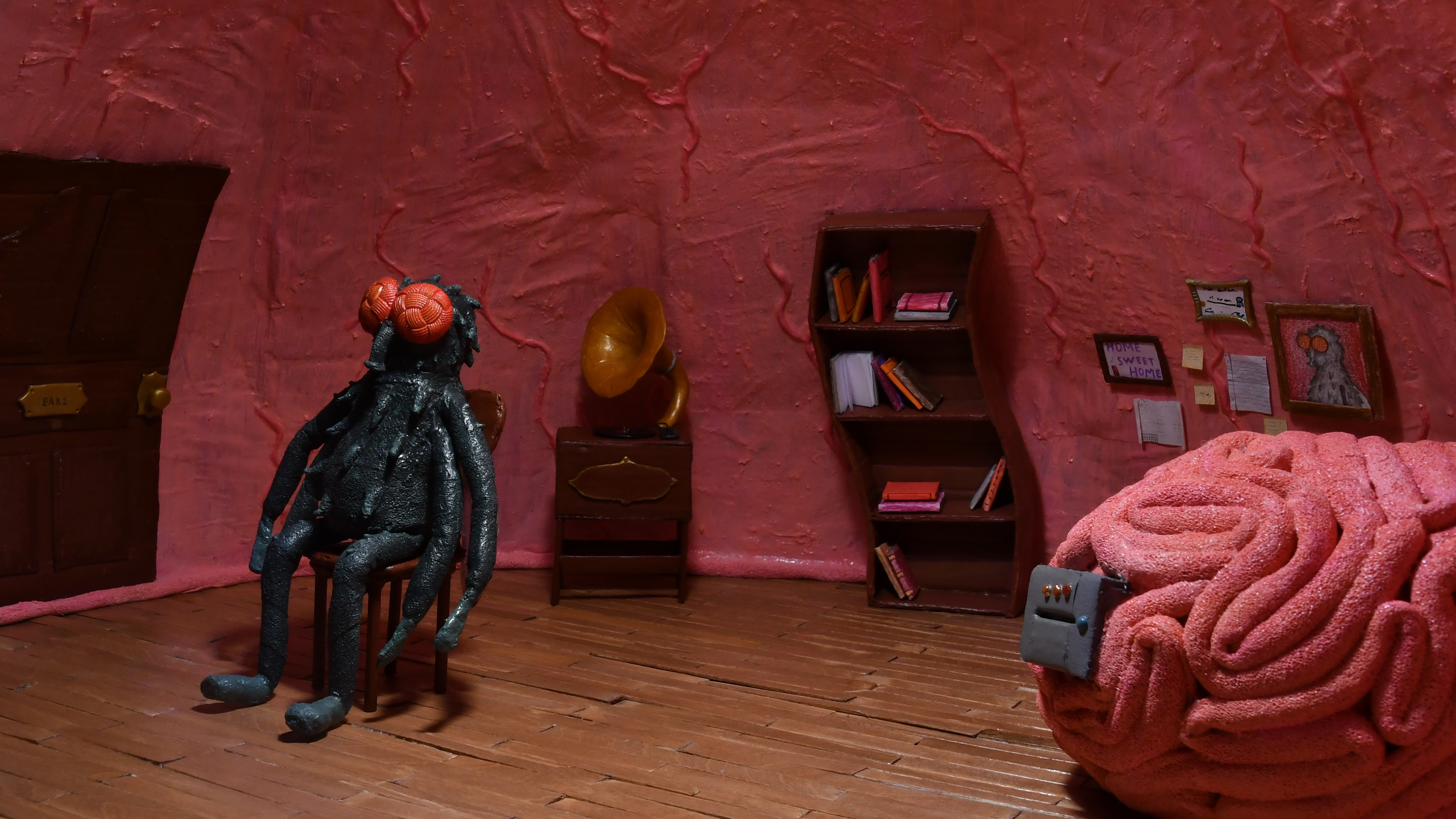 Inside My Head stop-motion set for my second semester Junior year film. The film is about a fly that gets stuck in a girls ear and lives inside her head. Everything was crafted with whatever I could find in my hometown bedroom after my school closed due to the Covid-19 pandemic. The animation was shot and finished in my room at the end of May and the private link is available upon request. See progress photos and material details further down