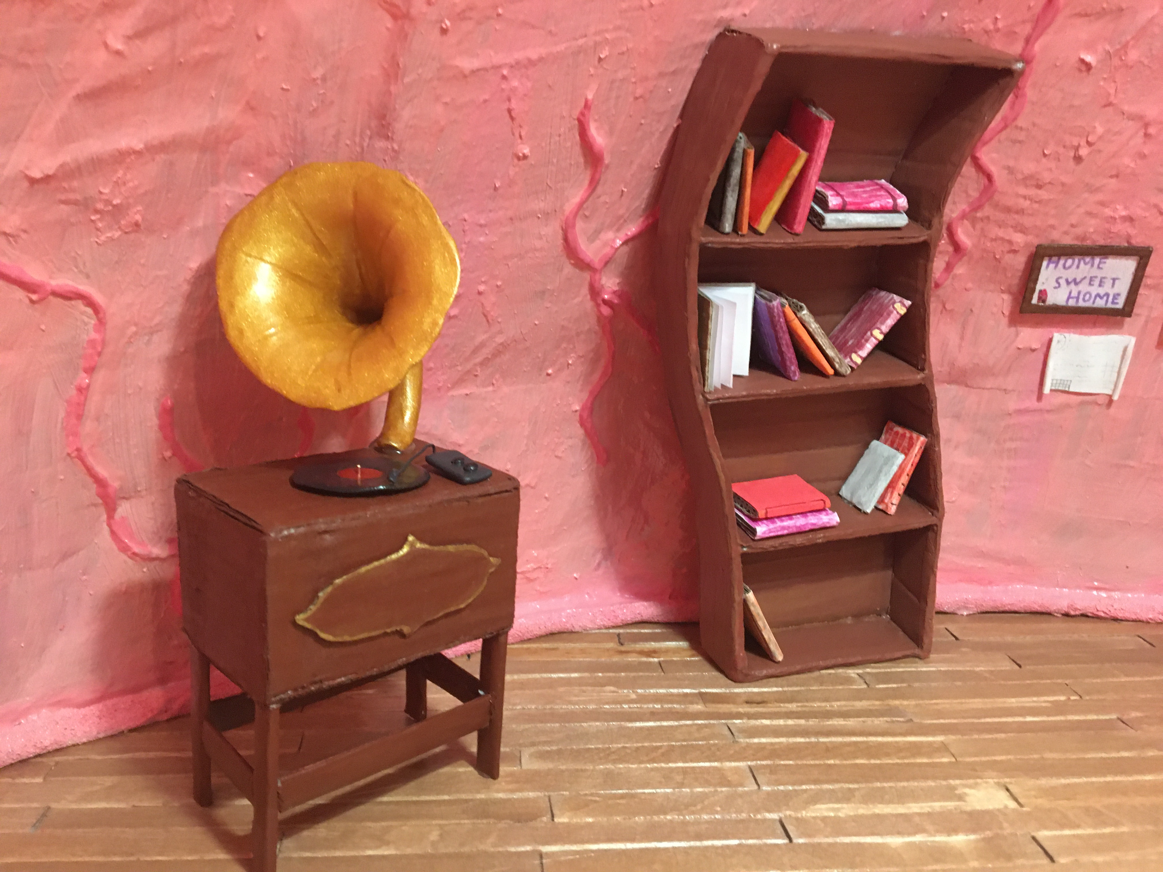 -Furniture is made from cardboard. Details of the vinyl record and doorknob were made from Sculpy oven bake clay and then painted.