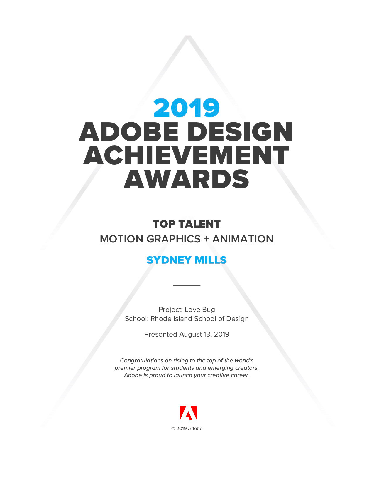 Featured in the 2019 Top Talent class of the Adobe Design Achievement Awards